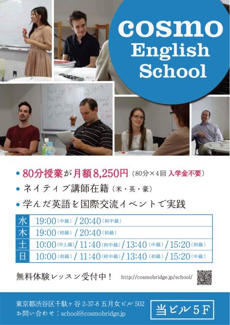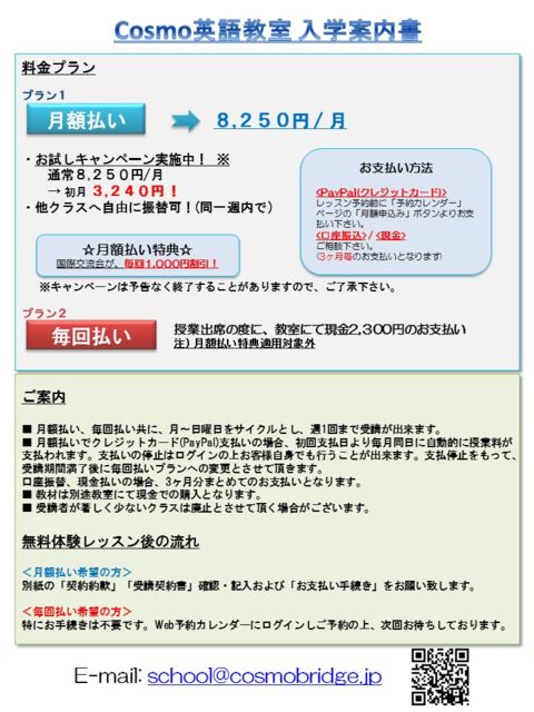 ±Ñ¸ì¥ì¥Ã¥¹¥ó¤Î¤´°ÆÆâ¡ª http://cosmobridge.jp/school/ »ä¤¿¤Á¤Î±Ñ¸ì¶µ¼¼¤ÎÆÃħ¤Ï¡¢¡Ø³Ê°Â¡Ù¤È¡Ø¹ñºÝ¸òή²ñ¡Ù¤Ç¤¹¡£ ÎÁ¶â¤Ï¡¢½é·î¤Ï3,240±ß¡ª(¥¥ã¥ó¥Ú¡¼¥óÃæ) ¤½¤Î¸å¤Ï8,250±ß¤È¤Ê¤ê¤Þ¤¹¡£ ¤Þ¤¿¡¢¹ñºÝ¸òή²ñ¤ò·î¤Ë3²ó¤Û¤É¹Ô¤Ê¤Ã¤Æ¤ª¤ê¡¢À¸Å̤ÎÊý¤ÏËè²ó1,000±ß¤Î³ä°ú¤òŬÍѤµ¤»¤ÆÄº¤¤¤Æ¤ª¤ê¤Þ¤¹¡£ ½µ°ì²ó¤Î±Ñ¸ì¤Î¡Ø³Ø½¬¡Ù¤À¤±¤Ç¤Ê¤¯¡¢¹ñºÝ¸òή²ñ¤Ç³°¹ñ¿Í¤Îͧ¤À¤Á¤ò¤¿¤¯¤µ¤óºî¤ê¡¢±Ñ¸ì¤ò¡Ø¼ÂÁ©¡Ù¤¹¤ë´Ä¶¤òÄ󶡤¹¤ë¤³¤È¤Ë¤è¤ê¡¢À¸Å̤Τߤʤµ¤ó¤Ë¤´¹¥É¾Äº¤¤¤Æ¤ª¤ê¤Þ¤¹¡£ ¤Ç¤Ï¡¢¤³¤³¤«¤é¤Ï±Ñ¸ì¶µ¼¼¤Î¤´°ÆÆâ¤È¤Ê¤ê¤Þ¤¹¡£ ¡¦½é²óÂÎ