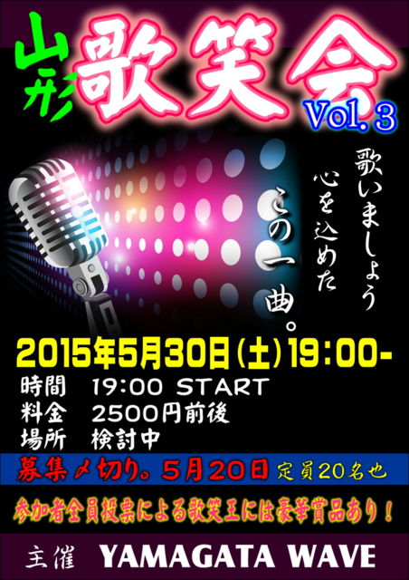 £µ·î£³£°Æü¡ÊÅÚ¡Ë£±£¹¡§£°£°¡Á ¡ØÂ裳²ó¡¦²Î¾Ð²ñ¢ö¡Ù Äê°÷¡¡£²£°Ì¾¡ÊÀèÃå¡Ë »þ´Ö¡¡19:00¡Á23:00 ÎÁ¶â¡¡2000±ß ¾ì½ê¡¡¥«¥é¥ª¥±¥¹¥¿¥¸¥ª¡¦¥µ¥ó¥é¥¤¥È ½»½ê »³·Á»ÔÀé¼êƲ90-2 Ãó¼Ö¾ì¤¬¾¯¤Ê¤¤¤¿¤á ¸©Î©Ãó¼Ö¾ì¤Î£ÄÃó¼Ö¾ì¤Ë18:40¤Ë ½¸¹ç¤·¤ÆÄº¤¾è¤ê¤¢¤¤¤Ç°Üư¤·¤Þ¤¹¡£ (Ìó£³Ê¬¤Î°Üư) »²²Ã´õ˾¤ÎÊý¤Ï¡¢¤³¤Î¥È¥Ô¥Ã¥¯¤Ë»²²ÃɽÌÀ¤ª´ê¤¤¤·¤Þ¤¹¡£ ¤Þ¤¿´´»öÁȤËľÀÜÏ¢Íí¤Ç¤â£Ï£Ë¤Ç¤¹¤¬¿ï»þ¤³¤Î¥Ú¡¼¥¸¤Ë £Õ£Ð¤·¤Æ¤¤¤¤Þ¤¹¡£ º£²ó¤âÁÇŨ¤Ê¥³¥é¥Ü¥ì¡¼¥·¥ç¥ó¤ä ¤â¤¦¤½¤ì¤Ï¥«¥é¥ª¥±¤òͤ¨¤¿¡¢¤Þ¤ë¤Ç£Ì£É£Ö£Å¤Î¤è¤¦¤Ê À¹¤ê¾å