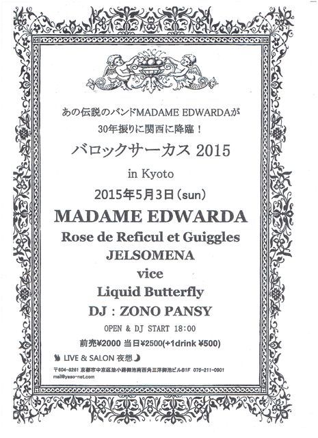 いよいよ今週末! MADAME EDWARDA "バロックサーカス" 三都ツアー。豪華共演者たちと繰り広げるアンダーグラウンドの祭典が5/3よりいよいよ開幕!!! 5/3@京都夜想、5/4@大阪難波ベアーズ。1985年以来30年ぶりとなる関西ツアー敢行。さらにツアーファイナルは東京@池袋CHOPにて開催します。ご期待ください。