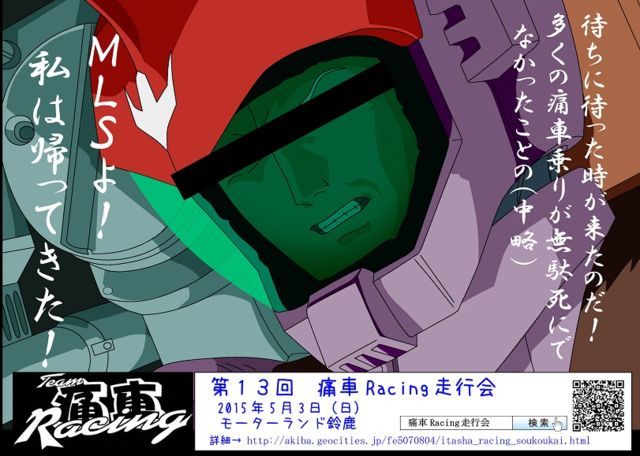 【第13回 痛車Racing走行会 in モーターランド鈴鹿 】 開催日時:2015年5月3日(日) 9:00〜17:00 場所:モーターランド鈴鹿 詳細はコチラ↓ http://akiba.geocities.jp/fe5070804/itasha_racing_soukoukai.html 今回の開催地はモーターランド鈴鹿です。 記念すべき、第1回痛車Racing走行会の開催地に帰ってきました!(>ω<) 今回も『初心者講習』と『同乗走行』を行いますので、 「初めてなの…やさしくして」 と言う方も、安心して参加ください。 もちろんしっかりしたクラス分けをしますので、ガチ勢も大歓迎です。