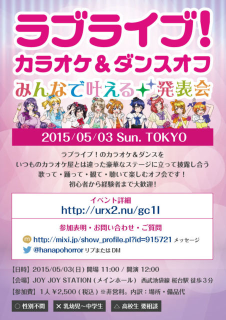 ¥é¥Ö¥é¥¤¥Ö¡ª¤Î¥«¥é¥ª¥±¡õ¥À¥ó¥¹¤ò¤¤¤Ä¤â¤Î¥«¥é¥ª¥±²°¤È¤Ï°ã¤Ã¤¿ ¹ë²Ú¤Ê¥¹¥Æ¡¼¥¸¡ÊºÇÂç18¿Í¾è¤ì¤Þ¤¹¡ª¡Ë¤ËΩ¤Ã¤ÆÈäϪ¤·¹ç¤¦¡¢ ²Î¤Ã¤Æ¡¦Í٤äơ¦´Ñ¤Æ¡¦Ä°¤¤¤Æ³Ú¤·¤à¥ª¥Õ²ñ¤Î»²²Ã¼Ô¤òÊ罸¤·¤Æ¤¤¤Þ¤¹¡£ ½é¿´¼Ô¤«¤é·Ð¸³¼Ô¤Þ¤ÇÂç´¿·Þ¡ª °ì½ï¤Ë¥¹¥Æ¡¼¥¸¤Ç²Î¤Ã¤¿¤êÍ٤俤ꤷ¤Æ¤ß¤Þ¤»¤ó¤«¡©¡© ¸Ä¿Í¤Ç¤â¤ªÍ§Ã£¤È°ì½ï¤Ç¤â£Ï£Ë¡ù ¤´»²²Ã¤ªÂÔ¤Á¤·¤Æ¤¤¤Þ¤¹¡ª ¡ÚÆü»þ¡Û 2015/05/03¡ÊÆü¡Ë³«¾ì 11:00 / ³«±é 12:00 / ½ªÎ»19:00ͽÄê ¡Ú²ñ¾ì¡ÛJOY JOY STATION¡Ê¥á¥¤¥ó¥Û¡¼¥ë¡Ë ÅìµþÅÔ À¾ÉðÃÓÂÞÀþ ºùÂæ±Ø ÅÌÊâ3ʬ ¡ÊÃÓÂޱءÁºùÂæ±Ø¡§³ÆÄä¤ÇÌó10ʬ¡Ë http