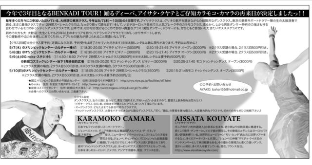 ¡ÚBENKADI JAPAN TOUR 2015¡Û º£Ç¯¤Ç£³Ç¯ÌܤȤʤ륢¥Õ¥ê¥«¥ó¥À¥ó¥¹¤Îº×ŵ¤Ç¤¹¡ª ¥¢¥¤¥µ¥¿¡¦¥¯¥ä¥Æ¤È¤´Â¸ÃÎ¥«¥é¥â¥³¡¦¥«¥Þ¥é¤ÎºÆÍèÆü¤¬·èÄꤷ¤Þ¤·¤¿¤Ã¡ª¡ª Ëèǯ¿¤¯¤ÎÊý¡¹¤Ë¤´»²²Ã¤¤¤¿¤À¤¤¤Æ¤¤¤ë¡¢Â繥ɾ¤ÎÅìµþ¥¯¥é¥¹¡£ º£Ç¯¤Ï5/7(ÌÚ)¡Á10(Æü)¤Î4Æü´Ö¤Ç¤¹¡£ ¥¢¥¤¥µ¥¿¥¯¥é¥¹¤Ï¡¢¥°¥ê¥ª¤Î²ÎÀ¼¤òݤ¤Ê¤¬¤é¤ÎĶìÔÂô¤Ê¥À¥ó¥¹¥¯¥é¥¹¡£ ¹ë²Ú¥µ¥Ý¡¼¥È¥É¥é¥Þ¡¼¿Ø¤ÎÀ¸¤ÎÂÀ¸Ý±éÁÕ¤ÇÍ٤롢¤Þ¤µ¤Ë¡Ö¥¢¥Õ¥ê¥«¡×¤Ê¥¯¥é¥¹¤Ç¤¹¤Ã¡ª ¤½¤·¤Æ¡¢¤¤¤Þ¤ä¥è¡¼¥í¥Ã¥Ñ³ÆÃϤÇÂç¿Íµ¤¥Ö¥ì¡¼¥¯Ãæ¤Î¥«¥é¥â¥³¥¯¥é¥¹¡£ ½À¤é¤«¤¯¡¢¤·¤«¤âÃËÀ¥À¥ó¥µ¡¼ÆÃ