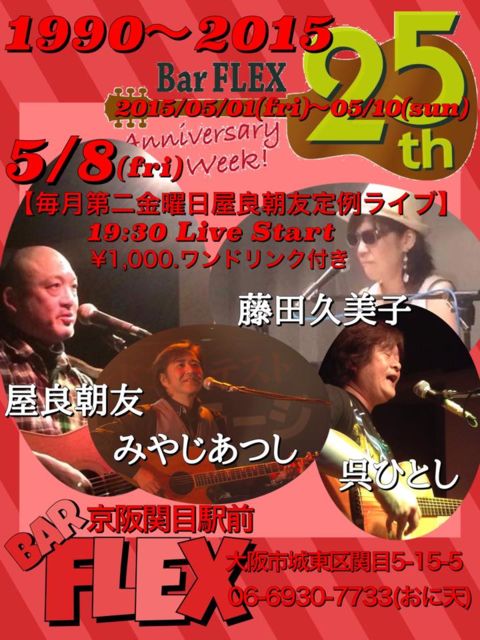 ¡Ú²°ÎÉīͧ¡÷FLEXÄêÎãLIVE¡õFLEX25¼þǯµÇ°LIVE¡Û Æü»þ¡¡¡¡¡¡2015ǯ5·î8Æü¡Ê¶â¡Ë ¡¡¡¡¡¡¡¡¡¡19:30¥¹¥¿¡¼¥È ¾ì½ê¡¡¡¡¡¡FLEX ¡¡¡¡¡¡¡¡¡¡¡¡Âçºå»Ô¾ëÅì¶è´ØÌÜ5-15-5 ¡¡¡¡¡¡¡¡¡¡¡¡06-6930-7733¡Ê¤ª¤ËÅ·¡Ë ÎÁ¶â¡¡¡¡¡¡¡ï1000¡Ê1drinkÉÕ¡Ë Â¾½Ð±é¡¡¡¡Æ£Åĵ×Èþ»Ò¡¿¸â¤Ò¤È¤·¡¿¤ß¤ä¤¸¤¢¤Ä¤· 2002ǯ¤«¤é¤ªÀ¤ÏäˤʤäƤª¤ê¤Þ¤¹FLEX¤Î25¼þǯµÇ°LIVE½µ´Ö¤Ç¤´¤¶¤¤¤Þ¤¹¡£ ¤¤¤Ä¤â¤è¤ê½Ð±é¿¤á¡¢³«±é»þ´ÖÁá¤á¤Ç¤ªÁ÷¤ê¤¤¤¿¤·¤Þ¤¹¡£