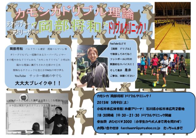 貴重なスペースいただきまして申し訳ございません。 詳細はこちら→http://tacchaan.exblog.jp/24341549/ フェイスブックはこちら→https://www.facebook.com/tacchaanriigu 今 youtubeでも大人気、すげー再生回数の カモシカドリブル理論で ちょー有名な天才ドリブラー ”岡部将和”さん (元Fリーガーでもあります) そう石川県小松市で開催です!! いつも動画を見て ふんふん とか なるほどーとか 思っている俺! そして君! ぜひこの機会に 岡部ドリブルマスターから そのコツを伝授してもらいましょう!!