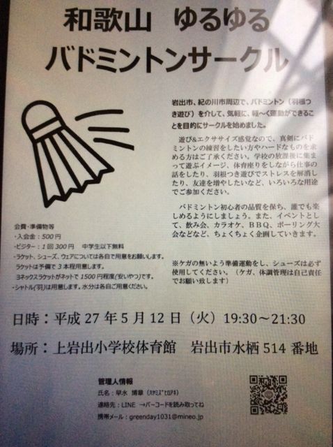 バドミントンサークルの第一回開催日が決まりました。 ゆるゆるなので、「ちょっと遊びにに来たよ」という感覚で結構です。途中入退場も良いので、気軽に参加して下さいね。 会費は初回は300円。2回目に参加された時に、入会金を頂きます。 ラケットは予備もありますので、参加される方の準備はウェアや靴、水分のみです。 お友達と参加して頂いても良いと思います。よろしくお願いします。