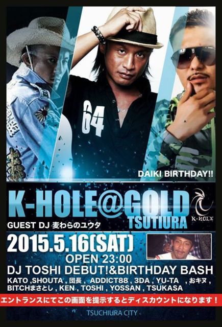 5月16日(sat)土浦GOLD K-HOLE 〜ALL PSYCHEDELIC〜 23:00 OPEN ■DAY ¥3000 ■DISCOUNT ¥2000 受付で団長のゲストと言って頂ければ ディスカウント料金になります タイムテーブル等追記はこちら↓↓↓ http://ameblo.jp/trancefamily/entry-11815521666.html DAIKI birthday GUEST DJ 麦わらのゆうた DJ's KATO(K-HOLE) 団長 (NOGA RECORDS/K-HOLE) addict88(K-HOLE) SHOTA(K-HOLE/天下統一) PONTA(STAR LINE) 3DA(K-HOLE) おキヌ(MAJESTICRECORDS) Bi