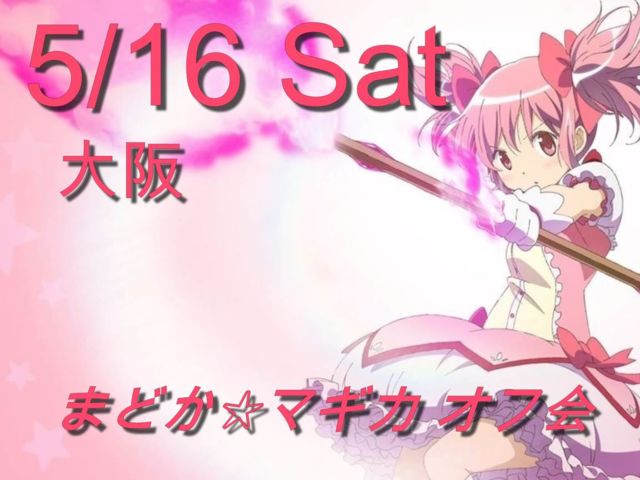 管理人様、スペースをお貸し頂きありがとうございます。 〔5/16(土)大阪 まどか✩マギカ オフ会」〕 20代・30代中心のイベントです♪ 人数に合わせて最適な会場をご用意します。 堅苦しい雰囲気はありませんのでお一人様でも気軽にご参加下さい ★「魔法少女まどか✩マギカ」好きが集まってワイワイ楽しくやろう!というシン
