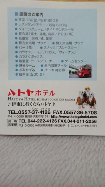 今年もやります恒例一泊ツー 今年は場所を変え、伊東ハトヤホテルにしました ・バイキング方式(飲み物別) ・お一人様 14000円(飲み物代・入浴税・消費税込み)となります。 ・人数30名 (予約済み) ・キャンセルは、7日前からかかります。 早い書き込みですので、都合を付けて皆さん参加お願いします 明細は、後日載せます。 温水プールもありますので、水着持参してもOKです