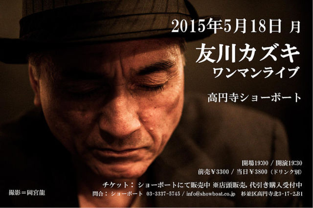 2015/5/18 高円寺ショーボートにて、 友川カズキさんのワンマンライブが開催されます! 開場 19:00 / 開演 19:30 前売 ¥3300 / 当日¥ 4000(ドリンク代別¥600) 前売チケットはショーボートにて発売中です。 遠方の方には、代引郵送(手数料¥580) のお申込みも受付けております。(公演日の10日前まで) ご予約も受付中。お待ちしております。 詳細は:ShowBoat 03-3337-5745 info@showboat.co.jp http://showboat1993.wix.com/showboat1993