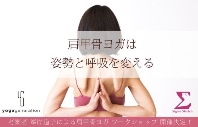 すでに話題騒然! 峯岸道子による肩甲骨ヨガ ワークショップ開催! http://www.yoga-gene.com/workshop/12419.html#content 数年前からブームになっている骨盤調整系のヨガメソッドはすでに体験された方も多いのではないでしょうか? しかし骨盤の調整はしても、肩甲骨までは考えなかった方が多かったのではないでしょうか? そこで峯岸先生が長年の指導経験をもとに考案したのが、この“肩甲骨ヨガ”というヨガメソッドです。 “腕は肩甲骨の付け根から生えている”その意識をもって腕を動かすことで、運動量や可動域の増加はもとより、