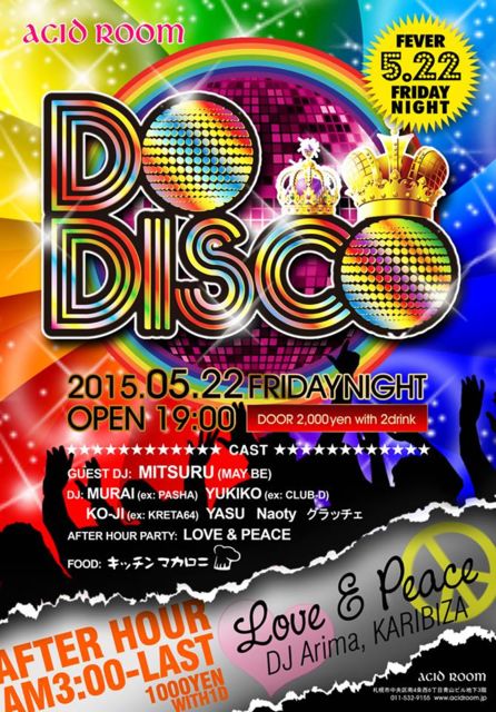 毎回毎回 世代を超えて参加者の心をワシづかみにしている 超HAPPYなDISCOイベント 【 DO DISCO 】 が約半年ぶりに開催です やっぱりみんなDISCOが大好き ってことで \(^o^)/ \(^o^)/ 今回はゲストDJに SOUL BAR 「MAY BE」 オーナーの MITSURU 氏を迎えて さらに幅広く充実した 「音の玉手箱」が期待できますよ 楽しく大騒ぎいたしましょう 今回も皆様の要望にお応えして PM 7:00 のオープンです かつてディスコで狂喜乱舞していた子持