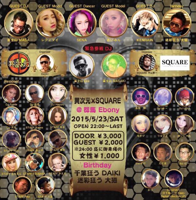 5月23日(土) 太田EBONY SQUARE×異次元 【DOOR】3000円 受付で団長のゲスト!と言って頂ければ 下記割引き料金になります Discount 2000円 ハッピーアワー特典 0時までに入場の女性は 1000円になります 今回群馬Ebonyに 人気イベントSQUAREと異次元がコラボで上陸! SOUL JAPANやSOUL SISTER でもお馴染み『SENA』が ゲストモデル&ダンサーで参戦! ゲストモデルには人気急上昇中の 『あいみん』や『レティマイ』が参戦! そして! 今大人気