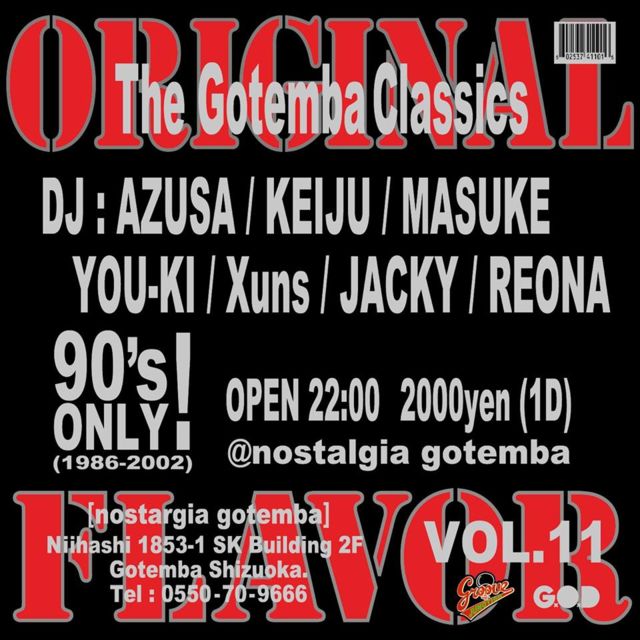 半年に1度の90'S HIP-HOP + 90'S R&B の祭典! 11回目の今回は場所をnostalgiaに変えての開催ですので お間違いのないように! 場所は変わっても音楽と雰囲気の良さは最高にHOT♪ CHECK IT 90'S!!!!! ORIGINAL FLAVOR Volume XI - GOTEMBA CLASSICS - [1988 - 2002 HIP-HOP, R&B ONLY] @nostalgia (御殿場) ♪ 90'S HIP-HOP + 90'S R&B + 元ネタ [1988 - 2002] OPEN 22:00 DAY 2000yen/1D ■DJs AZUSA KEIJU MASUKE YOU-KI Xuns JACKY REONA @nostalgia gotemba 静岡県御殿場市新橋1853-1 SKビル 2F 0550-70-9