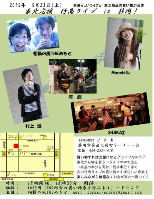 5月23日(土)東北応援行商ライブ 静岡で初開催! 東北から仕入れてきた商品を、最高の音楽を楽しみながらライブ会場でお買い物。 売り上げの半額は東北被災地、あるいは支援ボランティア団体に寄付します。 UHUさんのご協力で、静岡でも開催します!! 静岡UHU http://livehouse-uhu.com/ 18:00開場 18:30開演 1620円+1Drink 出演:相模の風THEめをと(東京)、Monchika(神奈川)、村上通(神奈川)、河鹿(静岡)、SHAKA2(静岡) お近くの方もそうでない方も! 静岡で一緒に楽しみましょう!