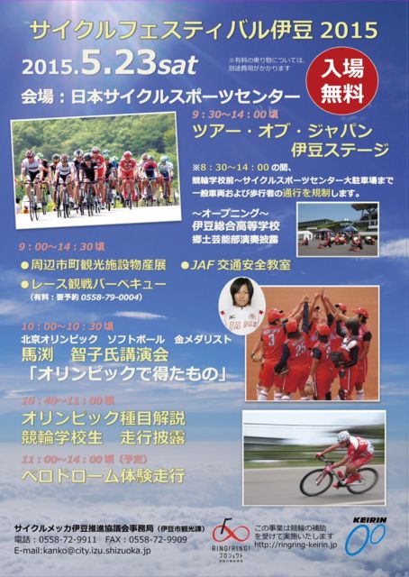 伊豆市の日本サイクルスポーツセンターの伊豆ベロドローム(屋内木製バンク)で無料体験走行ができます!! 当日は、ツアー・オブ・ジャパン伊豆ステージや最新のスポーツバイク試乗会などもありますので ぜひ、ご来場ください。当日は、日本サイクルスポーツセンターの入場料も無料となります。 イベント名:サイクルフェスティバル伊豆2015 会 場:日本サイクルスポーツセンター 内 容:9:00〜ツアー・オブ・ジャパン伊豆ステージ オープニングセレモニー 9:30〜ツアー・オブ・ジャパン伊豆ステージスタート