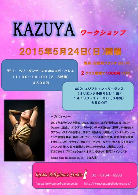 ¤³¤ÎÅٽ갤¹¤ë¥«¥¹¥Ð¥Ù¥ê¡¼¥À¥ó¥¹¥¹¥¿¥¸¥ª¼çºÅ¤Ç Bellydancer KAZUYA¤µ¤ó¤ò¤ª¾·¤¤·¤Æ¥ï¡¼¥¯¥·¥ç¥Ã¥×¤ò³«ºÅ¤¹¤ë¤³¤È¤¬·èÄꤷ¤Þ¤·¤¿¡ª¡ª £²£°£±£µÇ¯£µ·î£²£´ÆüÆüÍËÆü WS1:¡¡¥Ù¥ê¡¼¥À¥ó¥µ¡¼¤Î¤¿¤á¤Î¥è¥¬¡¦¥Ð¥ì¥¨ £±£±¡§£³£°¡Ý£±£´¡§£°£°¡Ê£²¡¥£µ»þ´Ö¡Ë ¼õ¹ÖÎÁ¡¡£´£µ£°£°±ß WS2:¡¡¥ª¥ê¥¨¥ó¥¿¥ë¥Ù¥ê¡¼¥À¥ó¥¹£±¶Ê¿¶¤êÉÕ¤± £±£´¡§£³£°¡Ý£±£µ¡§£³£°¡Ê£³»þ´Ö¡Ë ¼õ¹ÖÎÁ¡¡£¶£µ£°£°±ß ¢¨ £²¥¯¥é¥¹¼õ¹Ö¤Î¾ì¹ç¤Ï£±£°£°£°±ßoff ¤ª¿½¤·¹þ¤ß¤Ï¥«¥¹¥Ð¥Ù¥ê¡¼¥À¥ó¥¹¥¹¥¿¥¸¥ª¤Þ¤¿¤Ï»ä¤Þ¤Ç¤´Ï¢Íí¤¯¤À¤µ¤¤¡ù