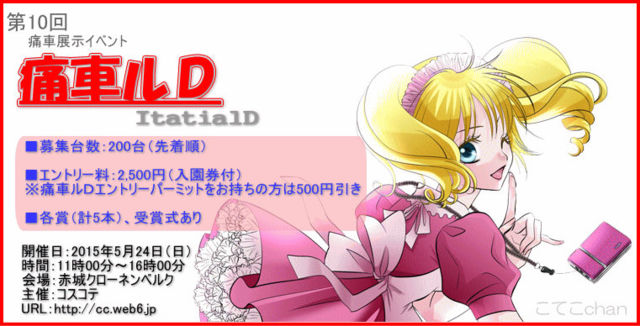 http://cc.web6.jp/pc/syousai/150524_ita10/150524_ita10.htm 痛車の他、コスプレ、声優トークショウなどがあります! 【 詳 細 】 ■日時:2015年5月24日(日) 11時〜16時 ■会場:赤城クローネンベルク 駐車場 ■事前エントリー方法:5月20日(水)までに、エントリーフォームにて申し込み(先着200台) ■エントリー料:2,500円(クローネンベルク入園券付き) ※第1回〜5回痛車ルD開催時にご配布させて頂きました「痛車ルDパーミット」をお持ちの方は、500円引きの2,000円(ご優待価格)とさせて頂きます。 ■支払方