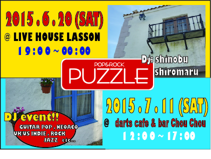 2015,6,20 (sat) pop&rock PUZZLE @LIVE HOUSE LASSON 丹波市春日町黒井2229 090-5896-5716 http://lasson.jimbo.com/ 19:00〜00:00 2015,7,11 (sat) pop&rock PUZZLE @ ダーツカフェ&バー Chou Chou 京都府福知山市中ノ町48-1 TEL 0773-45-8510 http://www.dartschouchou.com/darts/ 12:00〜17:00 DJ shinobu shiromaru PUZZLE CREW→jyunya'chester'shikata UK/US ROCK UK/US INDIE GUITAR POP NEOACO JAZZ etc・・・ 今回からレギュラー