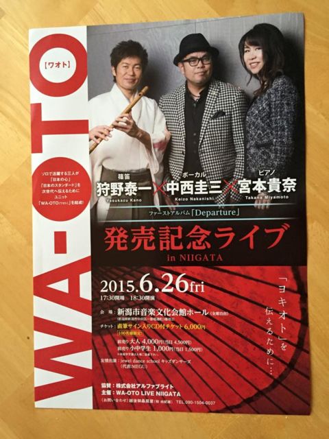 WAーOTO わおとコンサートご案内 是非 親子で!!幼き時の感動は一生! みんな聴いて 誘って 「日本のスタンダードを 次世代に繋ぐ」 6月26日(金) 新潟音楽文化会館ホール 開場 5:30〜 中西圭三さん vocal 狩野泰一さん 篠笛 宮本貴奈さん ピアノ Jewel dance schoolキッズダンサーズ Niigat Sake Lovers様セレクト 地酒有料試飲も!夜景と酒と音酔う夜 和が輪に繋がる和の音wa-oto新潟公演 是非! 続きは会場で\(^o^)/