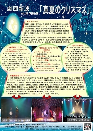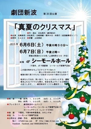 2015年の公演が決定しました(‘◇’)ゞ ★劇団新波vol.38「真夏のクリスマス」 □6月6日(土)午後6時30分〜、6月7日(日)午後2時〜 2回公演(開場は開演の30分前)上演時間90分(予定) □会場 4Fシーモールホール 「シーモール下関専門店街」(下関市、JR下関駅隣) □料金 一般(前売) 1,500円 (当日)2,000円 学生(前売) 1,000円 (当日)1,500円 ★プレイガイド 劇団新波ホームページ(http://www.shinpa.com) ローソンチケット 皆さん、今から予