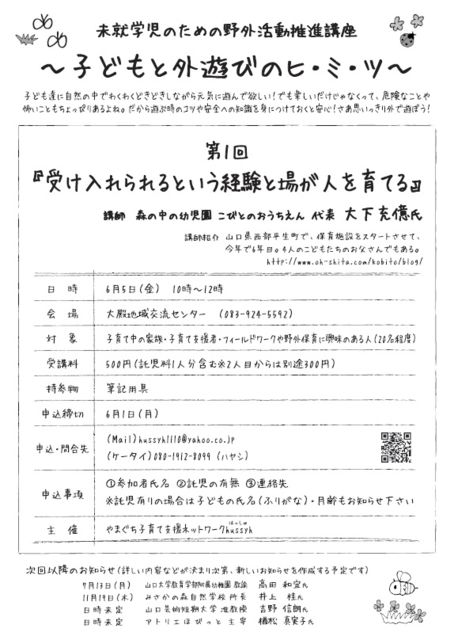 未就学児のための野外活動推進講座 〜子どもと外遊びのヒ・ミ・ツ〜 子ども達に自然の中でわくわくどきどきしながら元気に遊んでほしい! でも楽しいだけじゃなくて、危険なことや怖いこともちょっぴりあるよね。 だから遊ぶ時のコツや安全への知識を身につけておくと安心! さあ思いっきり外で遊ぼう! わたしたち子育て支援ネットワークhussyh(はっしゅ)では、外遊びに関する講座を今後6回計画しています その第1回目の講座の内容をお知らせします 「受け入れられるという経験と場が人を育てる」