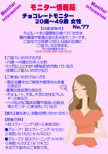 ¡ÚÂоݼԾò·ï¡Û ¥Á¥ç¥³¥ì¡¼¥È¤ò2½µ´ÖËèÆü¿©¤Ù¤Æ¤¤¤¿¤À¤¡¢ IJÆâ´Ä¶¤äÊØÄ̤ÎÊѲ½¤ò¤ß¤ë¥â¥Ë¥¿¡¼¤Ç¤¹¡£ ¤´¼«Âð¤Ç¤ÎºÎÊØ¡Ê2²ó¡Ë¤ÈÆü»ï¤ÎµÏ¿¤Ë¤´¶¨ÎϤ¤¤¿¤À¤¤Þ¤¹¡£ ¡Ú¤´¶¨ÎϤ¤¤¿¤À¤±¤ëÊý¡Û ¡¦20ºÐ¡Á49ºÐ¤ÎÆüËܿͽ÷À ¡¦6¥ö·î°Ê¾å¤Ë¤ï¤¿¤êÊØÈë¾É¾õ¤¬Â³¤¤¤Æ¤¤¤ëÊý ¡¦ºÎÊØ¤Ë¤´¶¨ÎϤ¤¤¿¤À¤±¤ëÊý ¡Ú¤´»²²Ã¤¤¤¿¤À¤±¤Ê¤¤Êý¡Û ¡¦¸½ºß¼£ÎÅÃæ¤Î¤´Éµ¤¤ä»ÈÍÑÃæ¤Î¤ªÌô¤Î¤¢¤ëÊý ¡¦½ÅÆÆ¤Ê´û±ýÎò¤Î¤¢¤ëÊý ¡¦¥Á¥ç¥³¥ì¡¼¥È¡¢µíÆý¡¢ÂçÆ¦¤ËÂФ¹¤ë¥¢¥ì¥ë¥®¡¼¤Î¤¢¤ëÊý ¡¦1¥ö·î°ÊÆâ¤ËÎ×¾²»î¸³¤ä¿©ÉÊ¡¦²½¾ÑÉÊÅù¤Î¥â¥Ë¥¿¡¼¤Ë»²²Ã¤ò¤·¤Æ¤¤¤ëÊý ¢¨¤½¤Î¾¾ò·ï