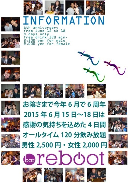 bar reboot 6th anniversary from June 15 to 18 / 4days 2015.6.15(mon)〜2015.6.18(thu) 4日間 感謝を込めた4日間 男性 2.500yen 女性 2.000yen 120分飲み放題