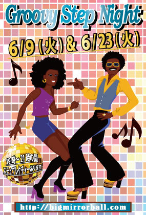 第2・第4の火曜日は【Groovy STEP NIGHT】19時〜21時位の間、簡単なステップとフリチャチャのレクチャーあります! 初心者の方、お一人様でも、当店スタッフがご対応させて頂きますのでどうぞお気軽にご参加ください♪ 【DJ】Hayasaka 【音楽】ALL MIX (21時位からは通常のDISCO TIMEになります。リクエストにも出来る限りお応えいたしますのでDJまでどうぞ♪ 【開催時間】 19:00〜24:00 【料金】 男性:¥2,000/2Drinks+ビュッフェ 女性:¥1,500/2Drinks+ビュッフェ (ビュッフェは19時よりご用意致しますが数量限定のため無