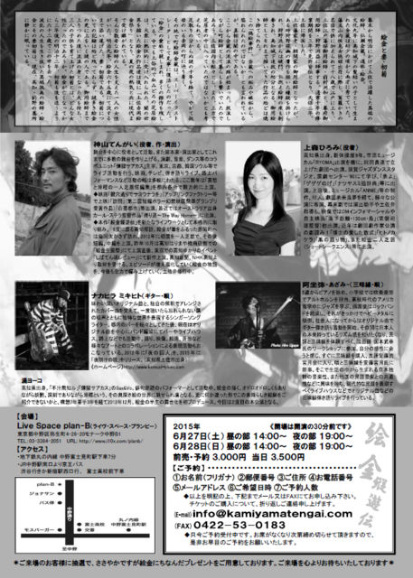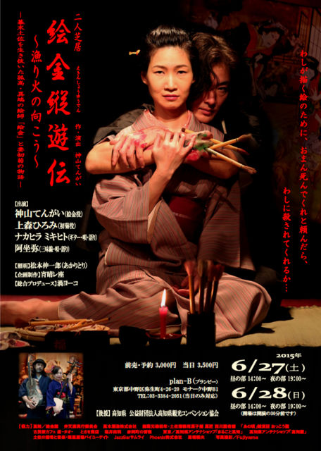 管理人様 お世話になっております。 貴重なスペースをお借りしまして、絵金の芝居公演の告知をさせて下さい。 どうぞ宜しくお願いいたします。 土佐の絵金が気になる方は必見の舞台です! 2012年の初演から、長い準備期間を経て、今回は二人芝居で挑みます! 絵金とその妻・初菊の物語でございます。 初菊さんの記録はほとんど残っておりませんが、その少ない情報から人物像を追いかけました。 見応えある舞台になるよう、役者・スタッフ一同、只今稽古に追われる日々でございます。 皆様のお越し