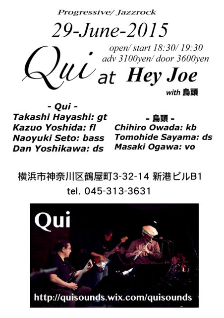 2015年6月29日 Qui at 横浜Hey Joe http://www.ne.jp/asahi/hey-joe/yokohama/ Qui 林隆史 guitar 吉田一夫 flute 瀬戸尚幸 bass 吉川弾 drums 烏頭 大和田千弘 piano, keyboards 佐山智英 drums 緒川真生 vocal open 18:30 start 19:30 予約 3100円 当日 3600円 横浜市神奈川区鶴屋町 3-32-14 新港ビルB1 Tel:045-313-3631 Qui HP http://quisounds.wix.com/quisounds 烏頭 HP http://uzuyouuzuyou.wix.com/uzusite