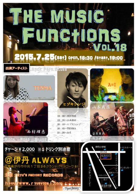 Ryu's factory¼çºÅ¥é¥¤¥Ö¤Î¤ªÃΤ餻¤Ç¤¹ THE MUSIC FUNCTIONS 2015 vol.18 ¡þÆü»þ¡§2015ǯ7·î25Æü¡Êsat¡Ë open 18:30¡¿start 19:00 ¡þ¥Á¥ã¡¼¥¸¡ï2,000¡¡¢¨£±¥É¥ê¥ó¥¯ÊÌÅÓÍ× ¡þ¾ì½ê¡§°ËðALWAYS ʼ¸Ë¸©°Ëð»ÔÃæ±û£±ÃúÌÜ£²¡Ý£µ¡¡¥°¥é¥ó¥É¥Ï¥¤¥Ä¥³¡¼¥ï£Â£± tel:072-770-8680 http://www.always-live.info/ ¡þ½Ð±é¥¢¡¼¥Æ¥£¥¹¥È¡§ 19:00¡Á¡¡À¾Â¼Íý·Ã 19:35¡Á¡¡»³Ëܾ¦Å¹ 20:10¡Á¡¡¥Ò¥Å¥¥·¥ó¥¸ 20:45¡Á¡¡TENMA 21:20¡Á¡¡A=I ¡þ¼çºÅ¡§Ryu¡Çs factory RECORDS http://www.ryusvocal.c