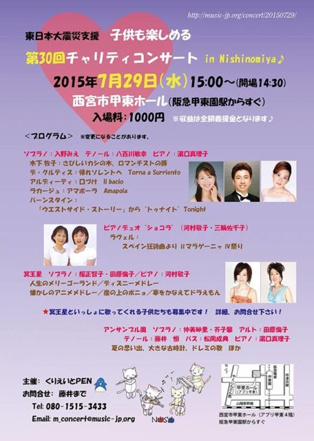 ÅìÆüËÜÂç¿ÌºÒ»Ù±ç¥Á¥ã¥ê¥Æ¥£¡¼¥³¥ó¥µ¡¼¥Èin À¾µÜ¡¡²ÆµÙ¤ß´ë²è¡¡»Ò¶¡½Ð±é¼ÔÊ罸 £²£°£±£±Ç¯¤ÎÅìÆüËÜÂç¿ÌºÒ¤Î¸å¡¢5·î¤è¤êǯ¿ô²ó¤¯¤ê¤¨¤¤¤Èpen¤µ¤ó¤Î¼çºÅ¤Ç³«ºÅ¤µ¤ì¤Æ¤¤¤ëÅìÆüËÜÂç¿ÌºÒ»Ù±ç¥Á¥ã¥ê¥Æ¥£¡¼¥³¥ó¥µ¡¼¥È¤ÎÂè30²óÌܤ¬£··î£²£¹Æü¹ÃÅì¥Û¡¼¥ë¤Ç¹Ô¤ï¤ì¤Þ¤¹¡£ ¡Ê¾ÜºÙ¤Ï¥Á¥é¥·¤ò¤´Í÷¤¯¤À¤µ¤¤¡Ë ²ÆµÙ¤ßÃæ¤Ê¤Î¤Ç¡¢À¾µÜ¤Ç³èư¤·¤Æ¤¤¤ë̽²¦À±¡Ê²Î¤Î¥Ü¥é¥ó¥Æ¥£¥¢ÃÄÂΡˤÈÉñÂæ¤Ç°ì½ï¤Ë²Î¤Ã¤Æ¤¯¤À¤µ¤ë¤ª»ÒÍͤòÊ罸¤·¤Æ¤ª¤ê¤Þ¤¹¡£ ËÜÈÖ¤À¤±¤Î»²²Ã¤âOK¤Ç¤¹¡£¡ÊÅöÆü¤Î¥ê¥Ï¡¼¥µ¥ë13»þȾ¡Á¤Ë¤´»²²Ã¤¯¤À¤µ¤¤¡Ë ½é¤á¤Æ¤ÇÉ԰¤ʤª»ÒÍͤË