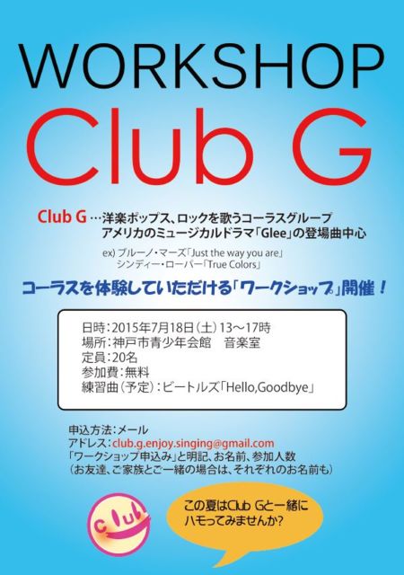 ¤Ï¤¸¤á¤Þ¤·¤Æ¡£ ¤³¤Á¤é¤ËÅê¹Æ¤µ¤»¤Æ¤¤¤¿¤À¤¯¤Î¤Ï½é¤á¤Æ¤Ç¤¹¤¬¡¢ Club G ¤ÏGlee ¤ÎÅоì¶Ê¤òÃæ¿´¤ËÍγڥݥåץ¹¤ä¥í¥Ã¥¯¤ò²Î¤¦¥³¡¼¥é¥¹¥°¥ë¡¼¥×¤Ç¤¹¡£ ¡ØHello, Goodbye¡Ù¡¢¡ØJust the way you are¡Ù¤ä¡ØTrue Colors ¡Ù¤Ê¤É¡¢²Î¤Ã¤Æ¤¤¤Þ¤¹¡£ ¤³¤Î²Æ¤ÏClub G ¤È°ì½ï¤Ë¥Ï¥â¤Ã¤Æ¤ß¤Þ¤»¤ó¤«¡© ¤ß¤Ê¤µ¤ó¤Ë¥³¡¼¥é¥¹Â賤·¤Æ¤¤¤¿¤À¤±¤ë¥ï¡¼¥¯¥·¥ç¥Ã¥×¤ò³«ºÅ¤·¤Þ¤¹¡£ ³ÚÉè¤ÏÆÉ¤á¤Ê¤¯¤Æ¤âÂç¾æÉסª ²Î¤ä¥Ñ¥Õ¥©¡¼¥Þ¥ó¥¹¤¬¹¥¤¤ÊÊý¡¢À§Èó¤´»²²Ã¤¯¤À¤µ¤¤¡£ Æü»þ¡§2015ǯ7·î18Æü(ÅÚ) 13:00¡Á17:00 ¾ì½ê¡§¿À¸Í»ÔÀľ¯Ç¯²ñ´Û ²»³Ú¼¼ Äê°÷¡§20̾ »²²ÃÈñ