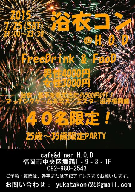 管理人様!!貴重なスペースお借り致します!! 7月26日に花火大会直前交流会!!を開催します!! 夏がやってきました!! これから浴衣、花火、祭りの季節です!! 今回の企画は、翌週にある8月1日の大濠花火大会に一緒に行く友達を見つけよう!という企画です!(≧▽≦) このパーティーで仲良くなった仲間同士、恋人同士でも(笑)気に入った人を翌週の花火大会に誘っちゃいましょう(≧▽≦) 勿論、8月に他でもあるであろう別の花火大会、9月の放生会でもいいです!!気軽に誘い合える相手をこのイベントで見つけてみ