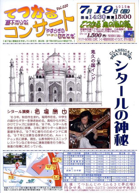 § CLASSICAL INDIA´S MUSIC シタールの神秘 § 《 日 時 》 7月19日(第三日曜日) 開場;午後2時30分/開演;午後3時 《 出 演 》 シタール演奏 相場 勝也(あいば かつや ) 《 会 費 》 1,500円【当日払い】 〔ドリンクバーのようなもの〕 100円でコーヒー・ジュース・焼酎などお代わり自由ですが、 お酒を楽しまれる方は西鉄バスをご利用ください。 なお、終了後に懇談会を予定していますが、飲み物や食べ物 の持ち込みは大歓迎です。 《 会 場 》 てつかる“鬼の面の座”〔