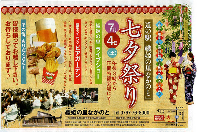 今回で第2回目を迎えました『七夕祭り』 その中で『能登リコLIVE』を開催致します♪ 今回は室内ので開催です。 今回の見どころとして、 出演者が単発で何度も登場するスタイルで、 飽きが来ないよう進行していきたいと思います。 フードコーナーや、短冊も設置してありますので、 飲みながら食べながらワイワイやりましょ♪ 是非、ご来場お待ちしておりますm(__)m ==以下詳細== ●日時 2015年7月4日(土) 一部 16:00〜18:00 二部 18:15〜20:00 ●場所 『道の駅 織姫の里なかのと』 〒929-1721 石川県鹿島郡中