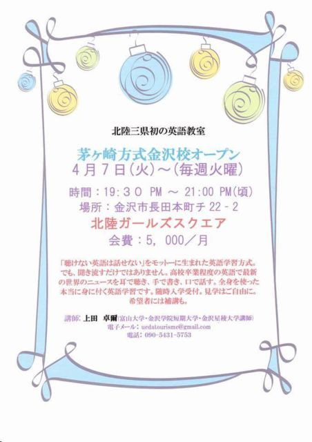 毎週火曜日の19時半〜21時 本気で英語を学びたい方向けのメソッド 茅ヶ崎式とは・・・ 「聴けない英語は話せない」を モットーに生まれた英語学習方式。 でも聞き流すだけではありません。 高校卒業程度の英語で最新の 世界のニュースを耳で聴き、手で書き、 口で話す。 全身を使った本当に身に付く英語学習です。 随時入学受付。 見学も受け付けています! ※補講もあり 講師:上田 卓爾先生 (富山大学、金沢学院短期大学、金沢星稜大学講師) 場所:北陸ガールズスクエア 金沢市長田本町チ22−2 金沢市民芸術村近く