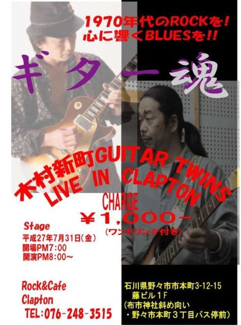 7月31日(金) 19:00オープン 20:00スタート 『 木村新町GUITAR TWINS monthly LIVE 』 1970年代のROCKを!! 心に響くBLUESを!! ギター魂 CLAPTON LIVE 第3弾 ミュージックチャージ 1,000円(ワンドリンク付)