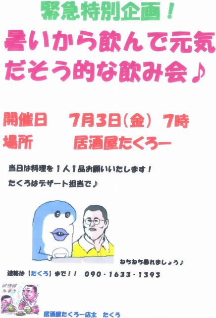 場所 居酒屋たくろー どうぞ!ご参加ください お一人様1品持ち寄りで♪ 自分の飲み物は持参でよろしゅーです♪