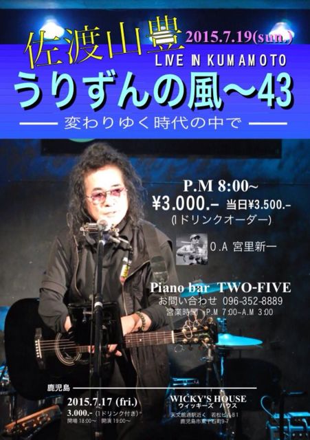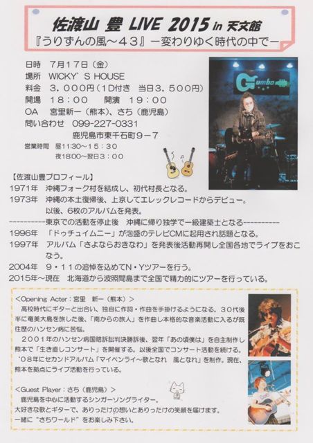 『うりずんの風〜43』 ー変わりゆく時代の中でー 7月17日(金) 鹿児島市天文館・WICKY'S HOUSE(ウィッキーズハウス) http://r.gnavi.co.jp/2h78shhd0000/ OA/さち・宮里新一 時間/開場:⒙:00 開演:19:00 料金/予約3000円/当日3500円(1d付き) 住所/鹿児島市東千石町9-7 若松ビルB1 お問い合わせ/WICKY'S HOUSE 099-227-0331 7月18日(土) 鹿児島県南さつま市・かりん さかうえけんいち/佐渡山豊 時間/開演19:00 料金/予約2500円/当日2800円 住所/鹿児島県南さつま市加世田村原1-9-13 お問い合わせ/かりん 0993