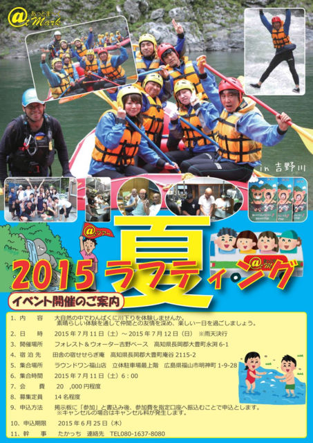 平成27年5月吉日 各位 イベントのご案内 〜ラフティングin吉野川〜 拝啓 時下ますますご清祥のこととお喜び申し上げます。平素は格別のご愛顧を賜り、心より御礼申し上げます。 さて、この度、下記要領にてイベントを開催させていただくこととなりました。 皆様にはご多用の折とは存じますが、ご友人ともお誘い合