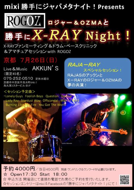¾¡¼ê¤Ë¥¸¥ã¥Ñ¥á¥¿¥Ê¥¤¥È¡ªpresents¡¡¡ØROGOZ¤È¾¡¼ê¤ËX-RAY Night¡ª¡Ù³«ºÅ·èÄꡪ ÌÀÆü6·î£²Æü¡Ê²Ð¡Ë19»þ¤è¤êͽÌó¼õ¤±ÉÕ¤±¥¹¥¿¡¼¥È¡ª X-RAY¤Î¥ê¥º¥à¤ò»Ù¤¨¤¿¥É¥é¥à¤Î¥í¥¸¥ã¡¼¤È¥Ù¡¼¥¹¤ÎOZMA¤¬¡ÖROGOZ¡×¤È¤·¤Æ³§¤µ¤ó¤ÎÁ°¤Ë¤ä¤Ã¤Æ¤¤Þ¤¹¡ª¡ª X-RAY¥Õ¥¡¥ó¥ß¡¼¥Æ¥£¥ó¥°¡õ¥É¥é¥à¡¦¥Ù¡¼¥¹¥¯¥ê¥Ë¥Ã¥¯¡õ¥¢¥Þ¥Á¥å¥¢¥»¥Ã¥·¥ç¥ó with ROGOZ X-RAY¤Î¥ê¥º¥à¤È¶¦±é¤Ç¤¤ëÌ´¤Î¤è¤¦¤Ê¥Á¥ã¥ó¥¹¡ª ¤â¤Á¤í¤ó³Ú´ï¤ò¥×¥ì¥¤¤·¤Ê¤¤¸«¤ë¤À¤±¤ÎÊý¤â£Ï£Ë¡ª ¡ù¡¡µþÅÔ³«ºÅ¡¡£··î£²£¶Æü¡ÊÆü¡Ë Live¡õMusic AKKUN¡ÇS¡Ê¸ÂÄê45̾¡Ë¡¡http://www.akkuns.com/