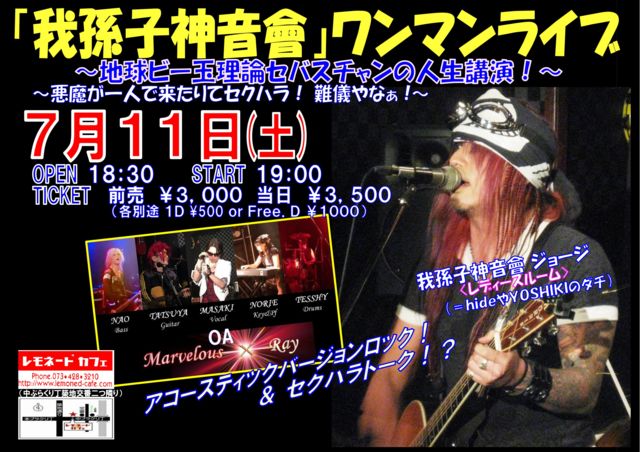我がMarvelous xRay、LADIESROOMのベーシストとしてルナフェスにも出演される 我孫子神音会 GEORGEさんのワンマンライブのオープニングアクトで出演することになりました! ■場所 レモネード カフェ http://www.lemoned-cafe.com/ ※和歌山市ぶらくり丁 ■日程 2015年 7月11日(土) 18:30 OPEN/19:00 START ■料金 前売り:¥3,000 当日:¥3,500 +1ドリンク ¥500 or フリードリンク ¥1,000 初めてのプロの方のOA、しかも憧れのGEORGEさんの手前、恥ずかしい演奏はできないのでメンバー全員で気愛入れまくりで演