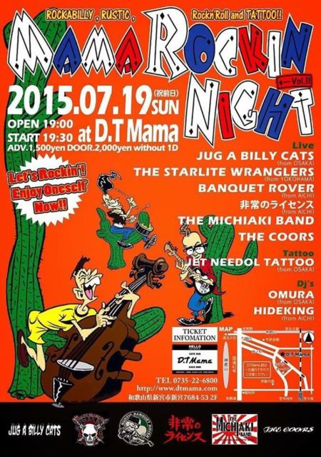 2015年07月04日(日)@和歌山 D.T Mama http://www.dtmama.com/ 『MAMA ROCKIN NIGHT VOL.11』 open 19:00 / start 19:30 ADV \1500 / DOOR \2000 + 1d ◆BAND◆ ・JUG A BILLY CATS(osaka) ・THE STARLITE WRANGLERRS(yokohama) ・BANQUET ROVER(aichi) ・非常のライセンス(aichi) ・THE MICHIAKI BAND ・THE COORS ◆TATTOO◆ ・JET NEEDOL TATTOO(osaka) ◆DJ◆ ・OOMURA(osaka) ・HIDEKING(aichi) 【D.T Mama】 和歌山県新宮市新宮7684-53 2F TEL 0735-22-6800