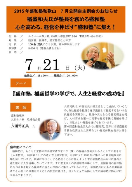 丸松セム株式会社 代表取締役会長 八頭司 正典 様 【盛和塾本部理事】 盛和塾和歌山様の【公開講師例会】『7月21日』 下記に、盛和塾和歌山(事務局)様からのご案内を、そのままご紹介させて頂きます。 -------------------- 盛和塾 塾生 各位 オブザーバー 各位 お世話になります。 盛和塾和歌山より 7月21日の例会ご案内をお送りいたします。 今回は盛和塾理事 丸松セム株式会社 八頭司会長をお迎えし ご講演をいただきます。... ご講演テーマは 『盛和塾、稲盛哲学の学びで、人生と経営の成功を』 第6回盛和塾全国大