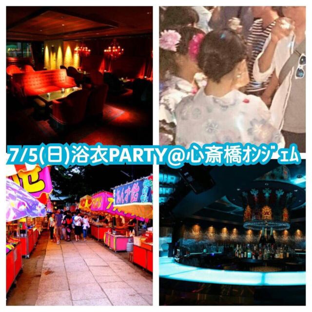 大好評頂いております☆♬☆♬ 現在人数 女性132 男性140 計272名 心斎橋駅からすぐのLuxuryな会場オンジェムを完全貸切♬♪ 前回大好評イベント(≧∇≦) この日は夏祭りにみたててかき氷等の無料屋台ブースも用意しちゃいます☆ 花火大会に一緒に行く素敵な相手を探したり、友達をいっぱい作りましょ〜 夏を楽しむために!!ここから夏を始めましょう☆*:.。. o(≧▽≦)o .。.:*☆ 7/5(日)19:00-22:00 会場:Live&Bar 11 住所:大阪市中央区西心斎橋1-4-5御堂筋ビル11階 値段:♂5,000円♀2,500円 ※上記は浴衣