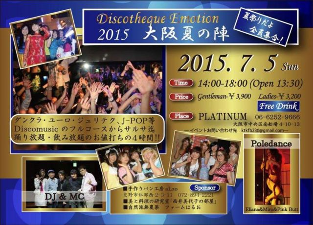 管理人様 告知失礼いたします。 5月になり、春というより初夏の日差しが降り注ぎ始めました^^ 夏の陣は従来のダンクラ、ユーロ、ジュリテク、JPOP等ディスコソングのフルコースに加えて流行のサルサまで取り入れることになりました。 場所はいつものプラチナム大阪です もちろん今回も飲み放題の4時間です!! 5回目になる「陣」は今までよりも更に内容を充実させて楽しいイベントにしたいと思います。 合言葉は「夏祭りだよ、全員集合!!」 夏の始まりは本イベントで迎えませんか? 日時 7月5日(日) 場