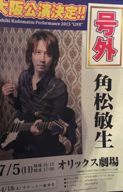 TOSHIKI KADOMATSU Performance 2015 2015年7月5日 開場16:15 開演17:00 料金 全席指定 8,500円(税込) (チケット一般発売日 4月18日) オリックス劇場 (旧大阪厚生年金会館) 〒550-0013 大阪市西区新町1丁目14番15号 サウンドクリエーター TEL 06-6357-4400(平日.12:00〜19:00) http://www.sound-c.co.jp/ *ファンクラブBIC会員の方へは、先行予約の号外ハガキを 1月下旬に発行致しますので、そちらをご覧下さい。 (2014.12.31付の郵便振替消印有効でご入会頂いた方まで) 尚、通常の優先予約とは異なり
