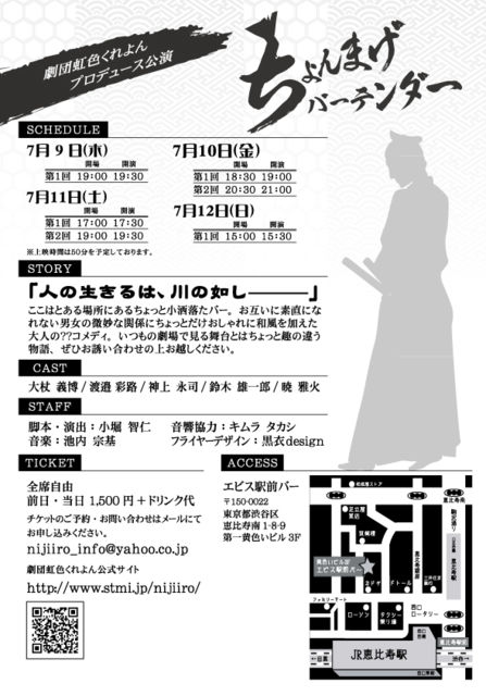 2013ǯ¤Ë¹¥É¾¤òÇ¤¿¡Ö¤Á¤ç¤ó¤Þ¤²¥Ð¡¼¥Æ¥ó¥À¡¼¡×¤ÎºÆ±é¤Ç¤¹¡£¥¥ã¥¹¥È¤òÆþ¤ìÂØ¤¨¡¢Ëܤâ²ÃÉ®¤·¤Æ¤Þ¤¿Á°²ó¤È¤Ï°ìÌ£°ã¤Ã¤¿±ØÁ°¥Ð¡¼¸ø±é¤ò¤ª³Ú¤·¤ß¤¯¤À¤µ¤¤¡ª ¸ø±é¾ðÊó ³«¾ì¤Ï³«±é¤Î30ʬÁ°¡£¤ª¤è¤½50ʬ¤ÎÉñÂæ¤Ç¤¹¡£ 7·î9Æü¡¡¡19:30³«±é ¡¡10Æü¡¡¡19:00³«±é¡¡¢21:00³«±é ¡¡11Æü¡¡¡17:30³«±é¡¡¢19:30³«±é ¡¡12Æü¡¡¡15:30³«±é ¤ª¼ò¤òÊÒ¼ê¤Ëµ¤·Ú¤Ë¸«¤ì¤ëÉñÂæ¤Ç¤¹¡£ ¤Á¤ç¤Ã¤È¤ª¤·¤ã¤ì¤Ê¡¢¼ÂºÝ¤Î¥Ð¡¼¤ò¼Ú¤ê¤Æ¤Î¸ø±é¡£ ÉñÂæ¤ò¸«¤¿¤³¤È¤Î¤Ê¤¤Êý¤Ç¤â¸ª¤Ò¤¸Ä¥¤é¤º¤Ë¡¢ ¤ª³Ú¤·¤ß¤¤¤¿¤À¤±¤Þ¤¹¡£ ¥Á¥±¥Ã¥ÈÂå1500±ß+¥É¥ê¥ó¥¯Â夬ÊÌÅÓȯÀ¸¤·¤Þ¤¹