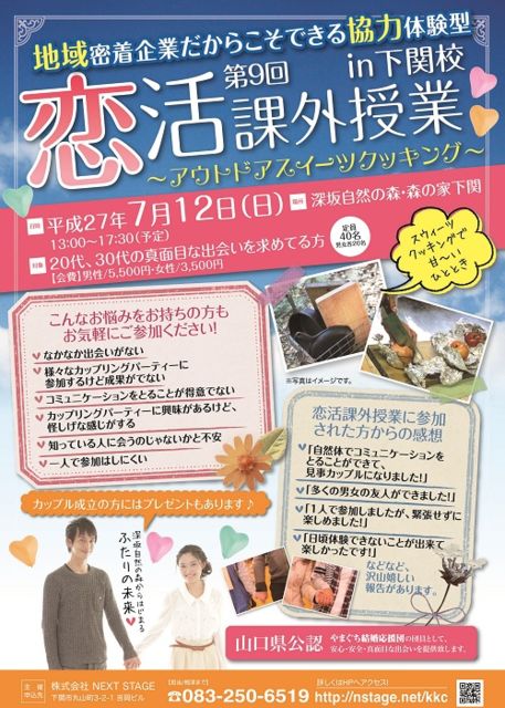 北九州の20代、30代の皆さまへ 協力体験型恋活ここにあり!第9回恋活課外授業IN下関校 アウトドアスイーツクッキングの巻 主催者 株式会社 NEXT STAGE (やまぐち結婚応援団 山口県公認) 実施日時 平成27年7月12日(日曜日) 13:00〜17:30(終了予定) ★★★過去開催風景等イベントの詳細はHPをご覧ください★★★ http://nstage.net/kkc 口コミ参加者が増えています!!地域密着企業だからこそできる 協力体験型カップリングパーティー。 ガッツリ長時間恋活イベントここにあり!! この